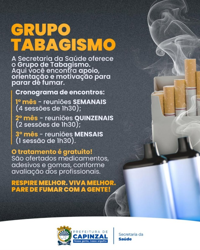 A Secretaria de Saúde de Capinzal está promovendo uma iniciativa voltada à qualidade de vida da população: o Grupo de Tabagismo, um programa estruturado para auxiliar pessoas que desejam abandonar o cigarro com suporte especializado e tratamento gratuito.