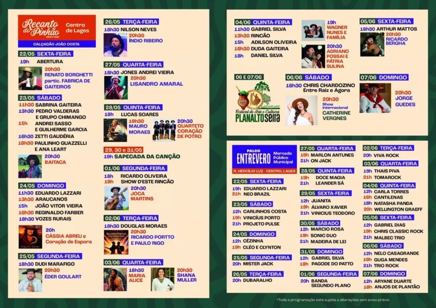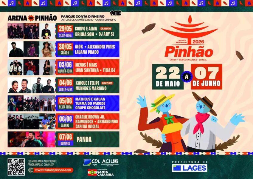 A programação oficial da 36ª Festa Nacional do Pinhão foi confirmada e deve movimentar o município de Lages, na Serra Catarinense, entre os dias 22 de maio e 7 de junho de 2026. Ao longo de 17 dias, o evento reunirá apresentações musicais, gastronomia típica, festivais nativistas e diversas atividades culturais, distribuídas em três principais espaços da cidade.